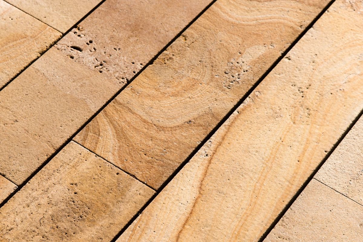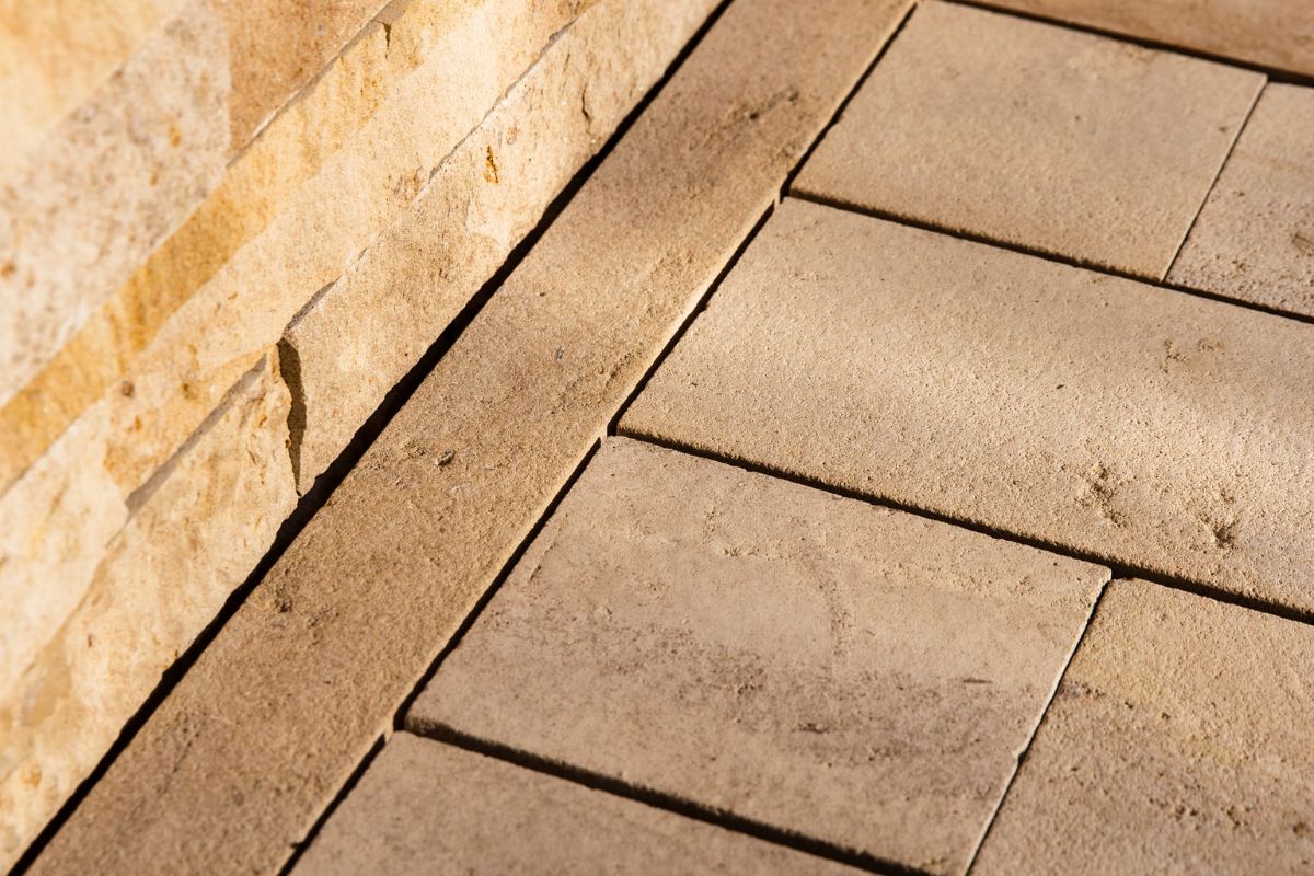 Für die Terrasse fiel die Wahl auf Kalkstein Seymour. Ein Naturstein mit warmer Ausstrahlung und ruhiger Struktur.